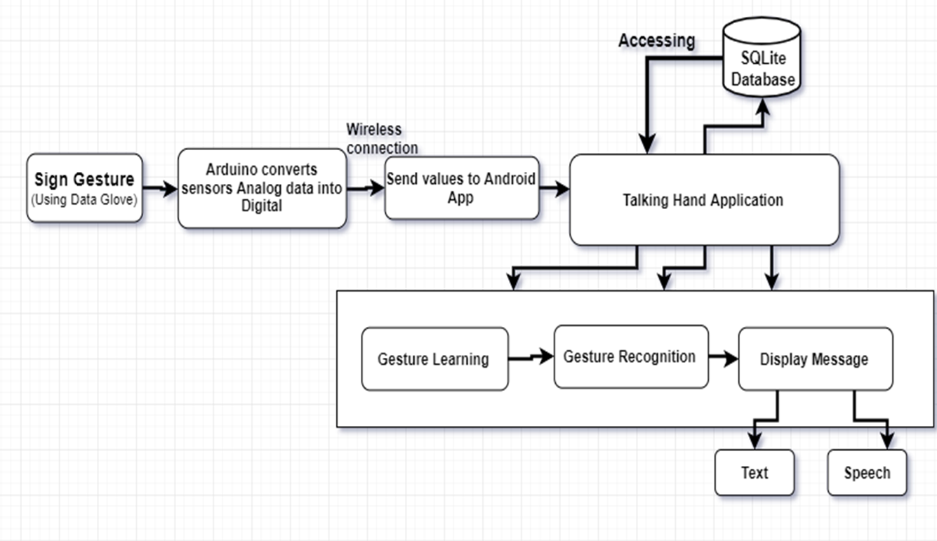 Communication is a basic fundamental human right, and every single person deserves to be a part of the global community. However, those who are deaf or mute, communicate differently than everyone else. Sign language is very important for people who have hearing and speaking deficiency. The only mode of communication for such people to convey their messages is through gesture/sign language. Therefore, we come up with solution of this communication problem in form of “Development of Talking Hand” project. This is hardware and software combined project which make use of Arduino Nano, Bluetooth module, Android device, an adaptive Android application and other hardware components integrated to form complete project for deaf community. This project is useful for both the deaf and normal community, where the gestures sign given by the deaf person is transferred through Bluetooth device in the Android application, which shows recognized gesture in form of texts and audio. Also, this system promotes two-way communication via mobile application, where a normal person (having none or partial knowledge of Sign language) can talk to deaf by just speaking in his/her native language or English language. It helps to resolve the need of an interpreter or any Sign language translator or prior knowledge of sign language by normal person. Moreover, the android application of this project is user friendly, and provides facility of PSL/ASL/OSL gesture learning through picture gallery, videos and learning games. The system is evaluated by testing on the deaf people and results show 90% accuracy of gesture recognition through Sign Learning and Sign Recognition algorithms. The main objective of this project is to develop a reliable, easy to use, light weight and portable smart hand glove system which can minimize the obstacles for the hearing impaired. Furthermore, it provides a wide range of gesture memory/storage facility with less power or energy usage; thus, particularly it has no memory and power constraints.